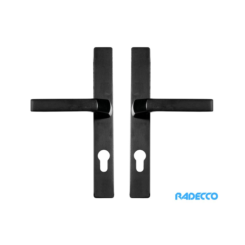 Klika s dlouhým štítem, která je z oceli s povrchovou úpravou černým lakem a je vhodná ke kterýmkoliv dveřím.